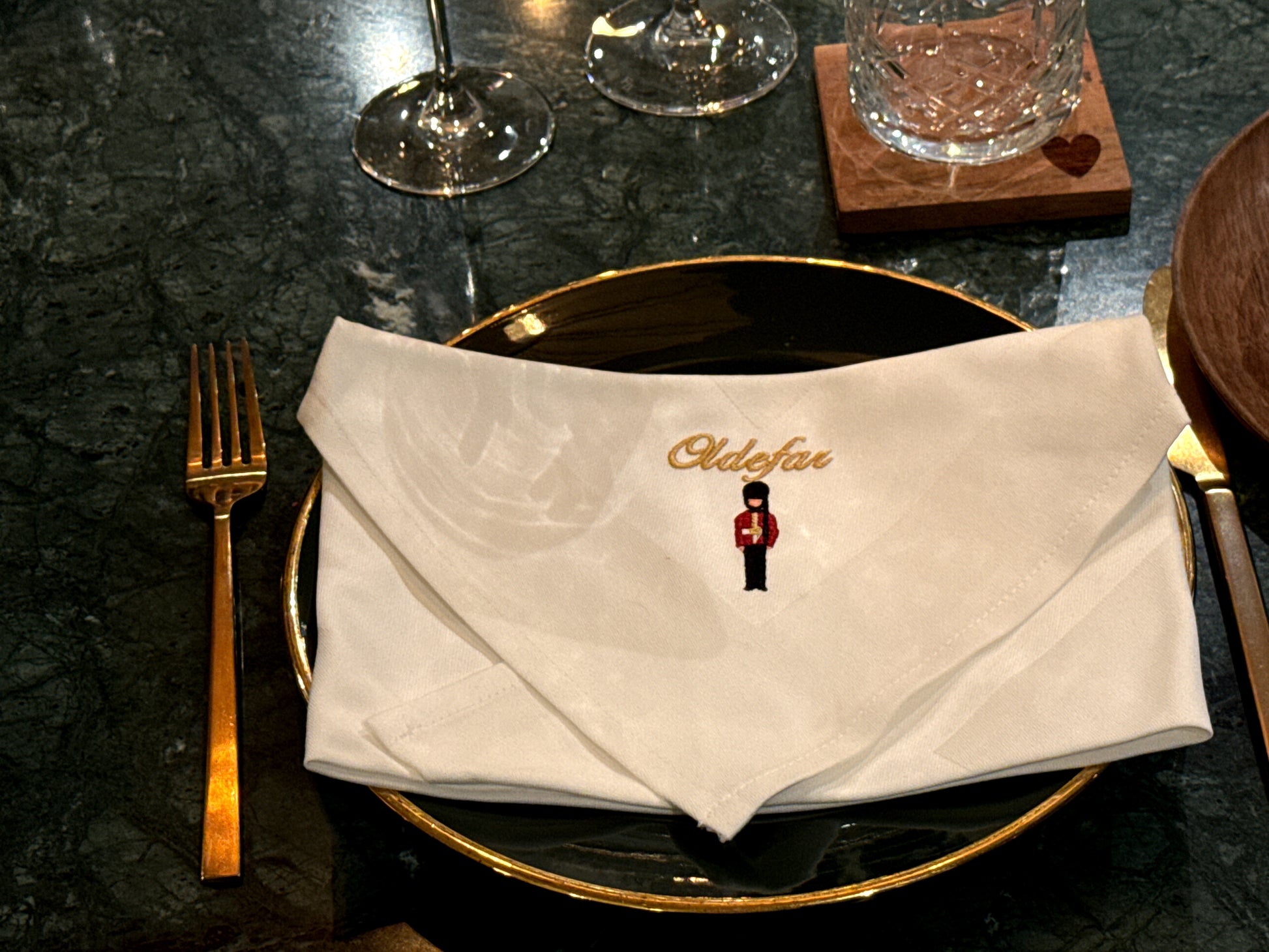 Outlet - Hvid serviet med garder og Oldefar navnebroderi